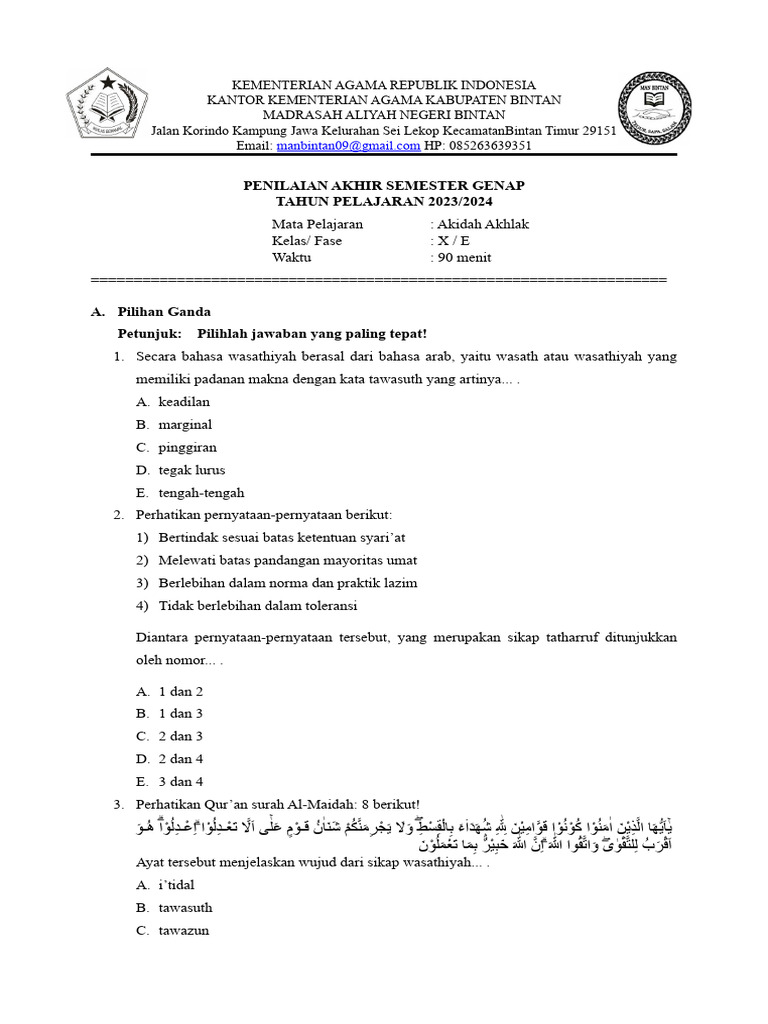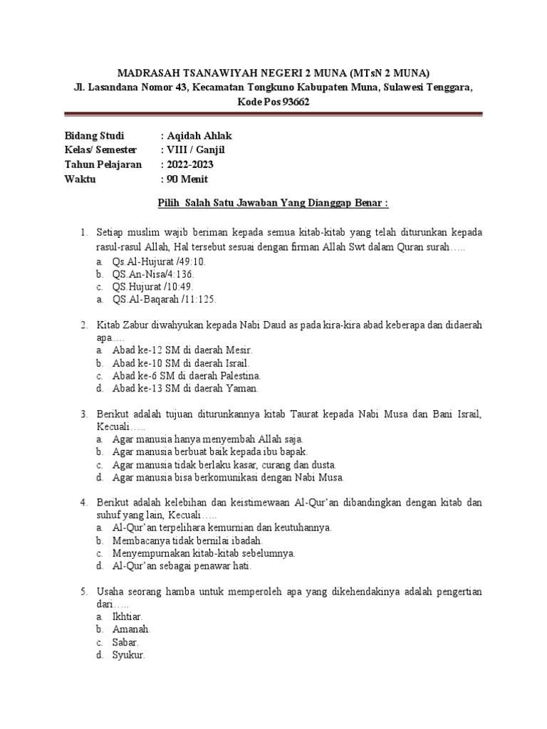 Artikel ini hadir sebagai panduan komprehensif yang menyajikan contoh-contoh soal Akidah Akhlak kelas 11 semester 2, lengkap dengan pembahasan mendalam. Tujuan utamanya adalah membantu siswa mempersiapkan diri menghadapi ujian, mengukur pemahaman, serta memperdalam penghayatan terhadap setiap materi. Kita akan menjelajahi berbagai topik, mulai dari pilar-pilar keimanan hingga akhlak terpuji dan tercela, serta adab-adab dalam Islam. Mari kita selami bersama samudra ilmu Akidah Akhlak ini.